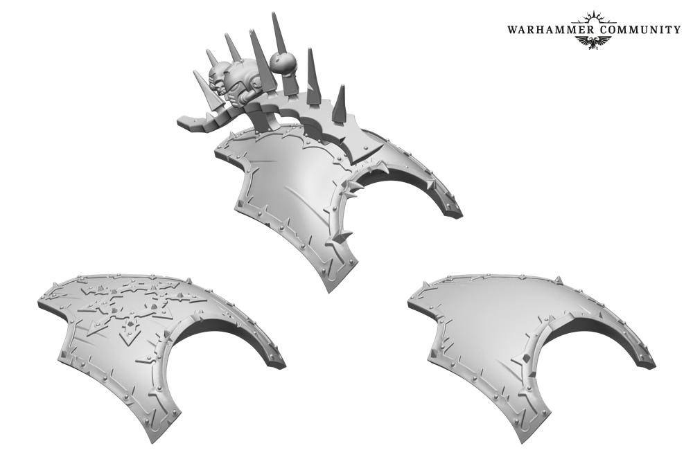 The great curved carapace above their head slot also has three variants – one with the eight-pointed star of Chaos, one in the throes of mutation with teeth and claws emerging from its trim, and one left free of major details so you can decorate it to your fancy. The second can also be anointed with a wicked-looking trophy rack, while the third can mount a decorative cowl in Thousand Sons style for some extra Prosperan vibes.