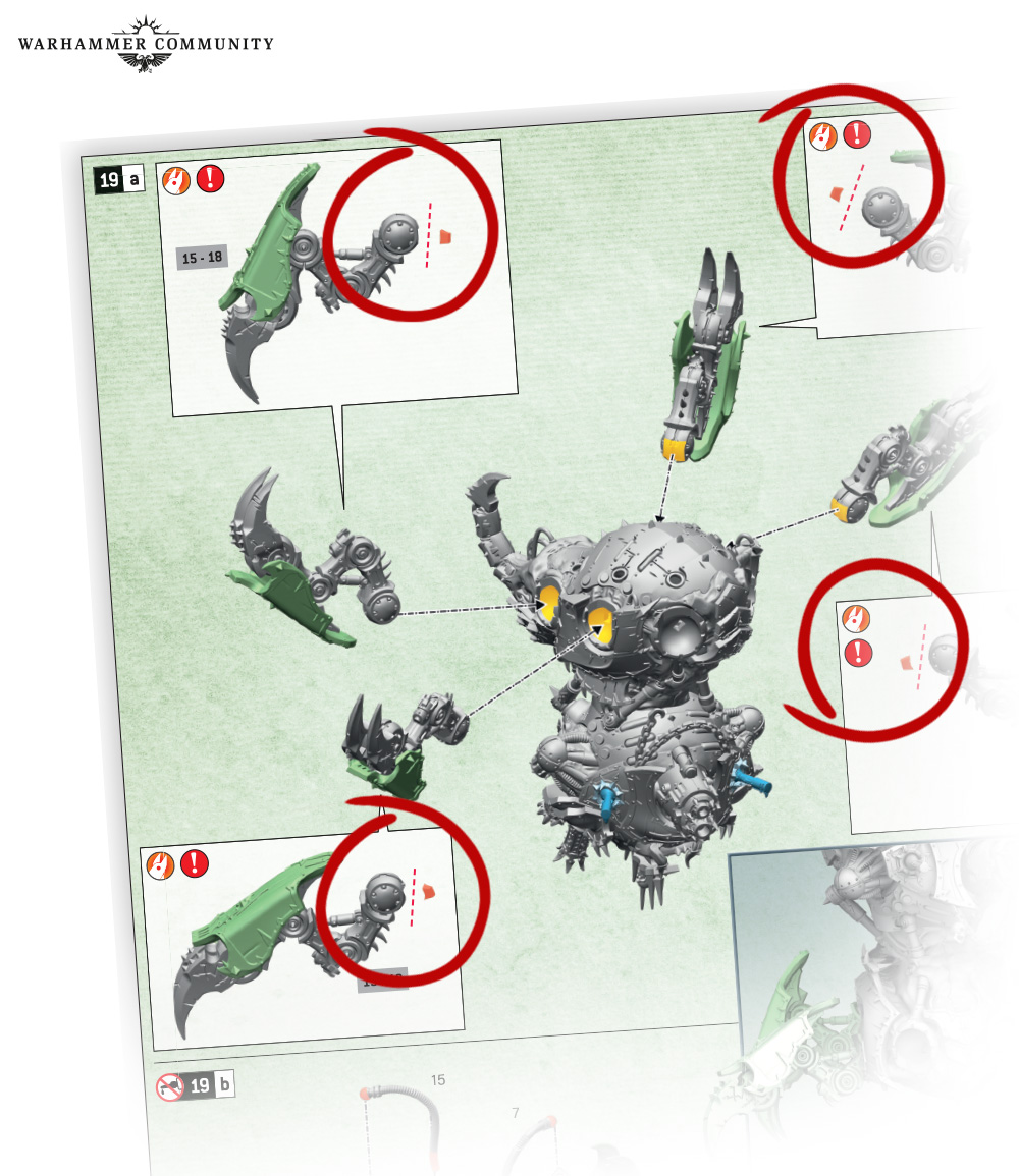 The legs. Possibly the Defiler’s most iconic feature,** the six scuttling legs can be arranged in the dynamic box art pose with the help of guiding pegs and extra basing bits. The construction manual knows you’ll want to mix it up, and also shows you all the bits you can cut off if you want complete freedom to pose them yourself.