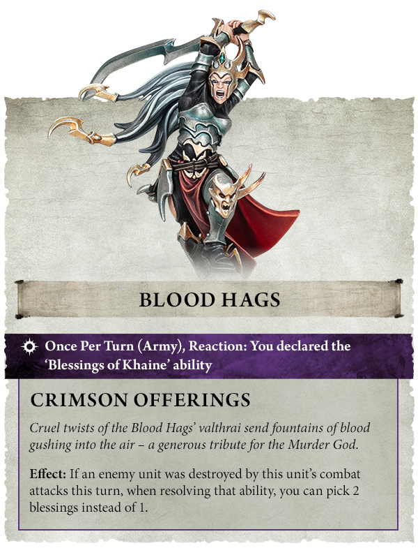 The flexibility of these blessings means you’ll always have just the right one to use at just the right time. What happens if you can’t decide and want to select two blessings? The new Blood Hags can help you out here with their Crimson Offerings ability, which gives you even more versatility.