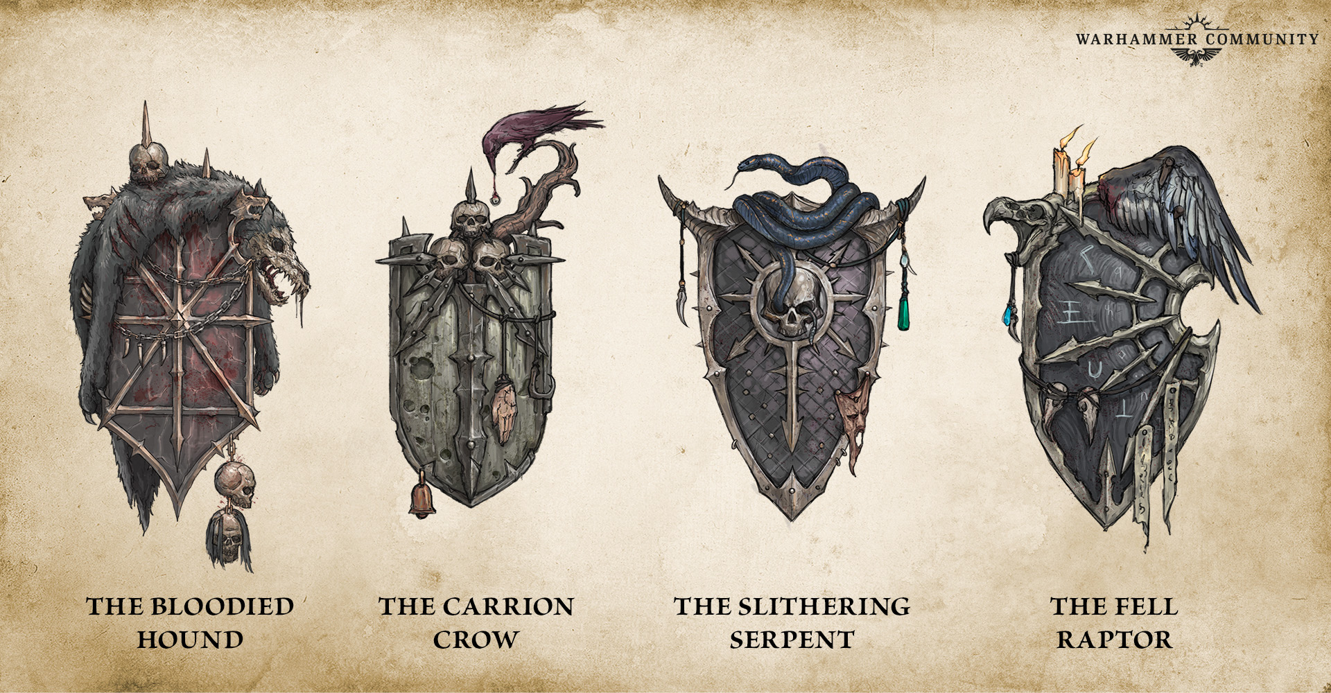 Yet the individual gods of Chaos, the greater powers, still persist, worshipped in cults throughout the Marauder Tribes. These cults, devoted to the Bloodied Hound, the Carrion Crow, the Slithering Serpent, and the Fell Raptor, are spread amongst the tribes, with some tribes wholly devoted to one, and others concealing numerous warrior lodges, each made up of members of a particular cult. These lodges are led by Shamans and Sorcerers, devotees of Chaos well versed in the nature of the Ruinous Powers and privy to many of the gods’ secrets, secrets which they spread amongst their followers. In this way, belief in the gods is kept alive in readiness for the day when the Chaos Gate at the top of the world opens once more and the gods return in all their glory to claim the World of Legend as their own.