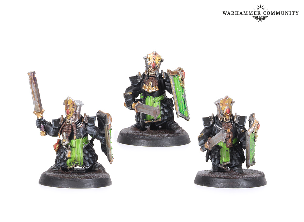I began by undercoating the models with Chaos Black, followed by a spray from above with Leadbelcher, then a liberal sponging of Stormhost Silver on the uppermost areas. I then applied a coat of Gryph-Hound Orange, followed by drybrushing layers of the appropriately named Hashut Copper and Sycorax Bronze. I tidied up the leafmail skirts with Abaddon Black and then drybrushed them with White Scar, before using Ardcoat varnish to give the look of black obsidian Blackshard Armour – a feature of the old Chaos Dwarfs.