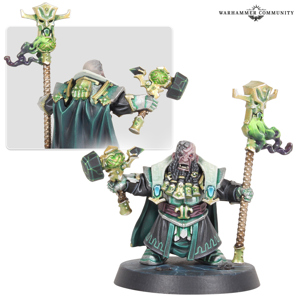 For the Ashen Elder of Ur-Zorn I chose to glaze Aeldari Emerald into the metal as a shade rather than the mix of cold and warm greens in the official box art, which I thought worked quite nicely over the pale Liberator Gold elements. For the War Despot, I mixed Abaddon Black into both Leadbelcher and Runelord Brass to create some darker metallics to complement the trim and details, which were based in Skullcrusher Brass. The dark robes made cutting back into shapes of the freehand easier, which made defining them less of a challenge.
