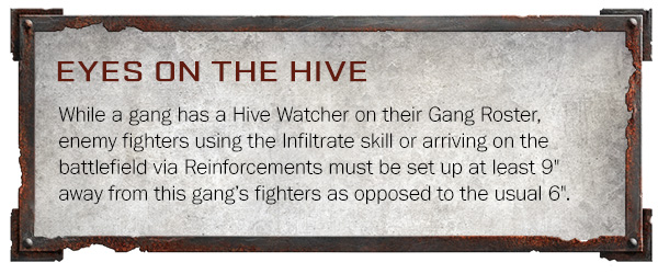 While a gang has a Hive Watcher on their Gang Roster, enemy fighters using the Infiltrate skill or arriving on the battlefield via Reinforcements must be set up at least 9" away from this gang’s fighters as opposed to the usual 6".