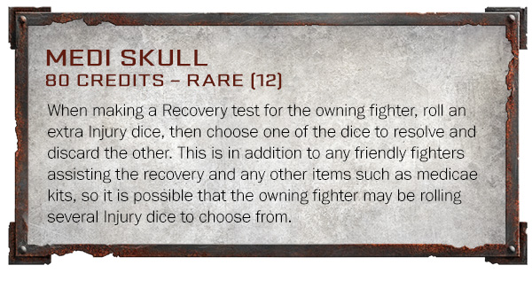 When making a Recovery test for the owning fighter, roll an extra Injury dice, then choose one of the dice to resolve and discard the other. This is in addition to any friendly fighters assisting the recovery and any other items such as medicae kits, so it is possible that the owning fighter may be rolling several Injury dice to choose from.