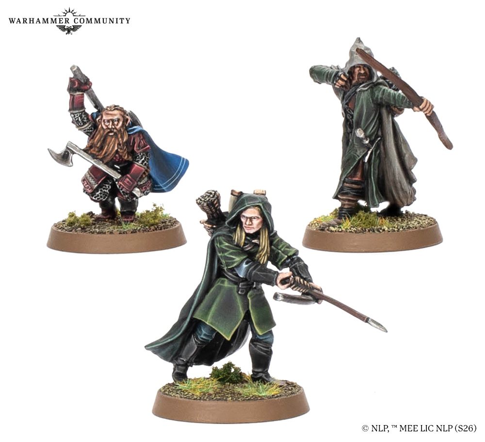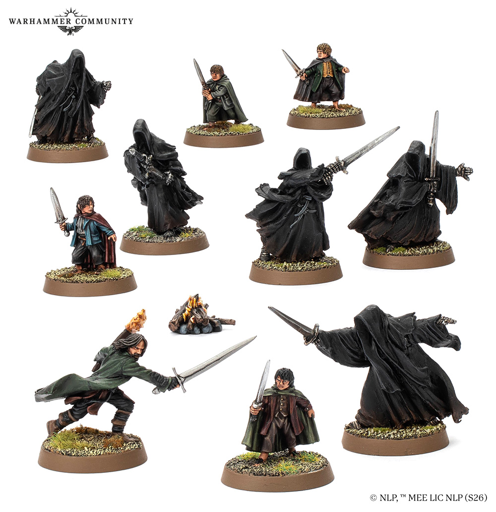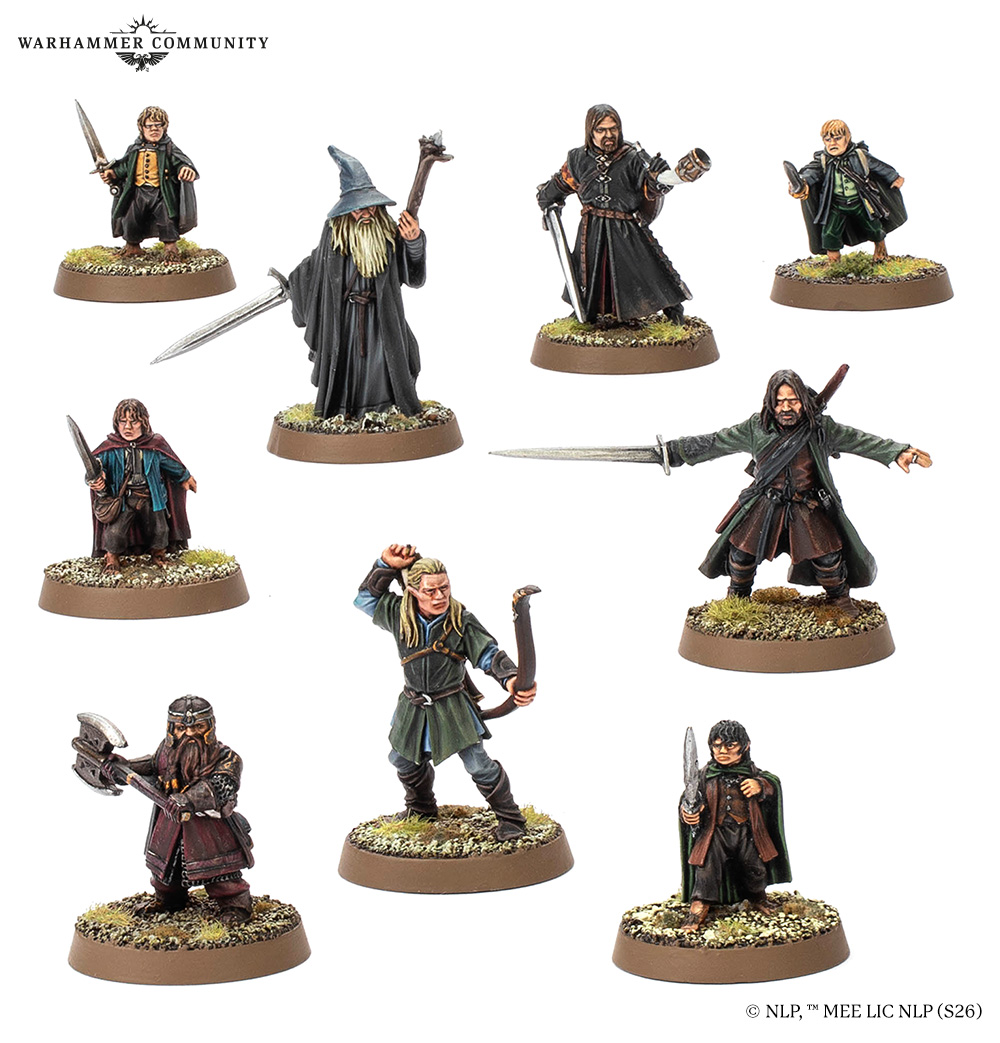 Our quest continues with the Fellowship of the Ring, representing the original nine heroes who set out from Rivendell on their daring journey to Mount Doom. The set includes versions intended for a Fellowship army depicting their original outfits and equipment, led by Gandalf the Grey and featuring Aragorn, Legolas, Gimli, Boromir, Frodo, Sam, Pippin, and Merry.