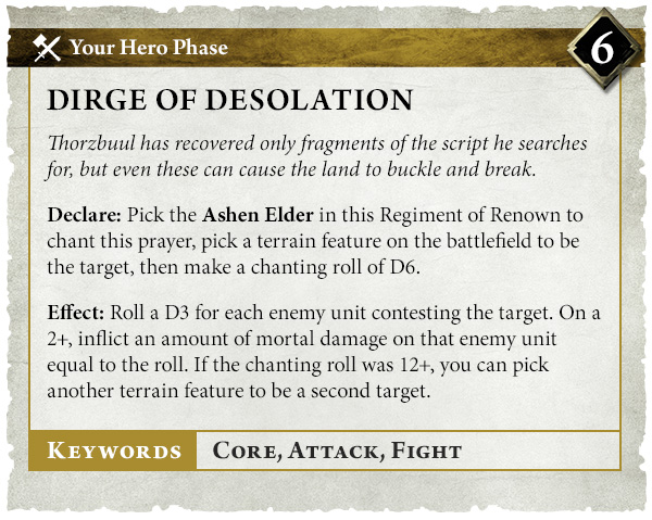 Declare: Pick the Ashen Elder in this Regiment of Renown to chant this prayer, pick a terrain feature on the battlefield to be the target, then make a chanting roll of D6.