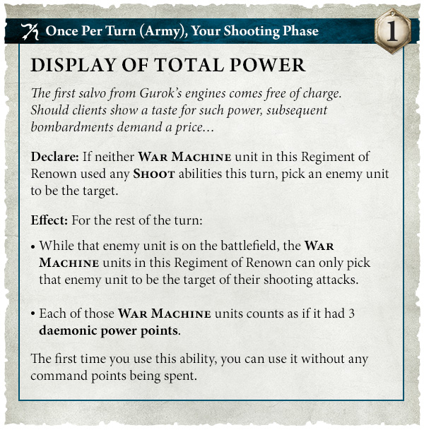 While that enemy unit is on the battlefield, the War Machine units in this Regiment of Renown can only pick that enemy unit to be the target of their shooting attacks.