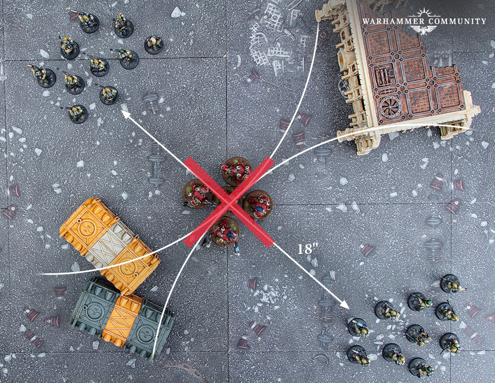 Consider spreading your units out to their maximum coherency to cover more ground. It’s good practice to keep units within 18" of each other (and 9" of the board edge) – that way your opponent cannot deploy a unit between them.