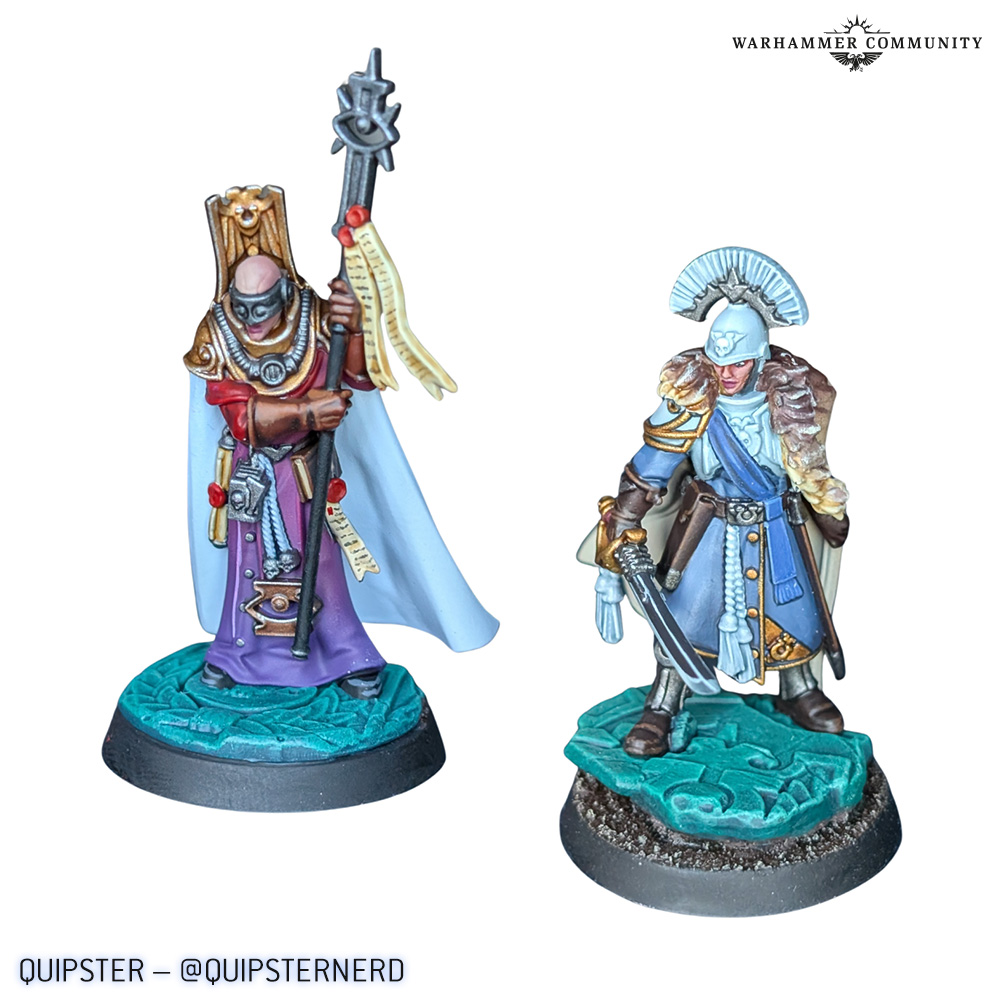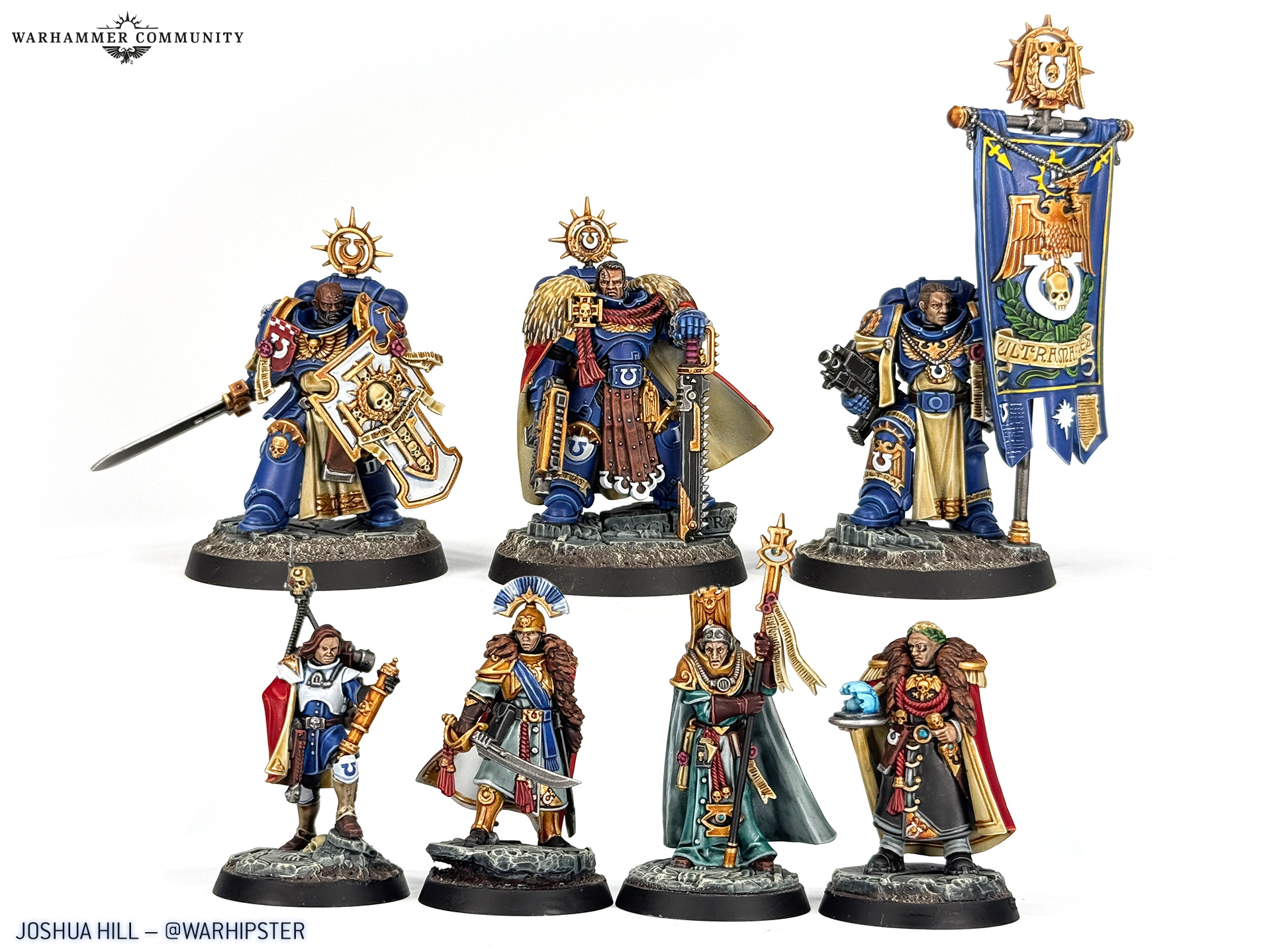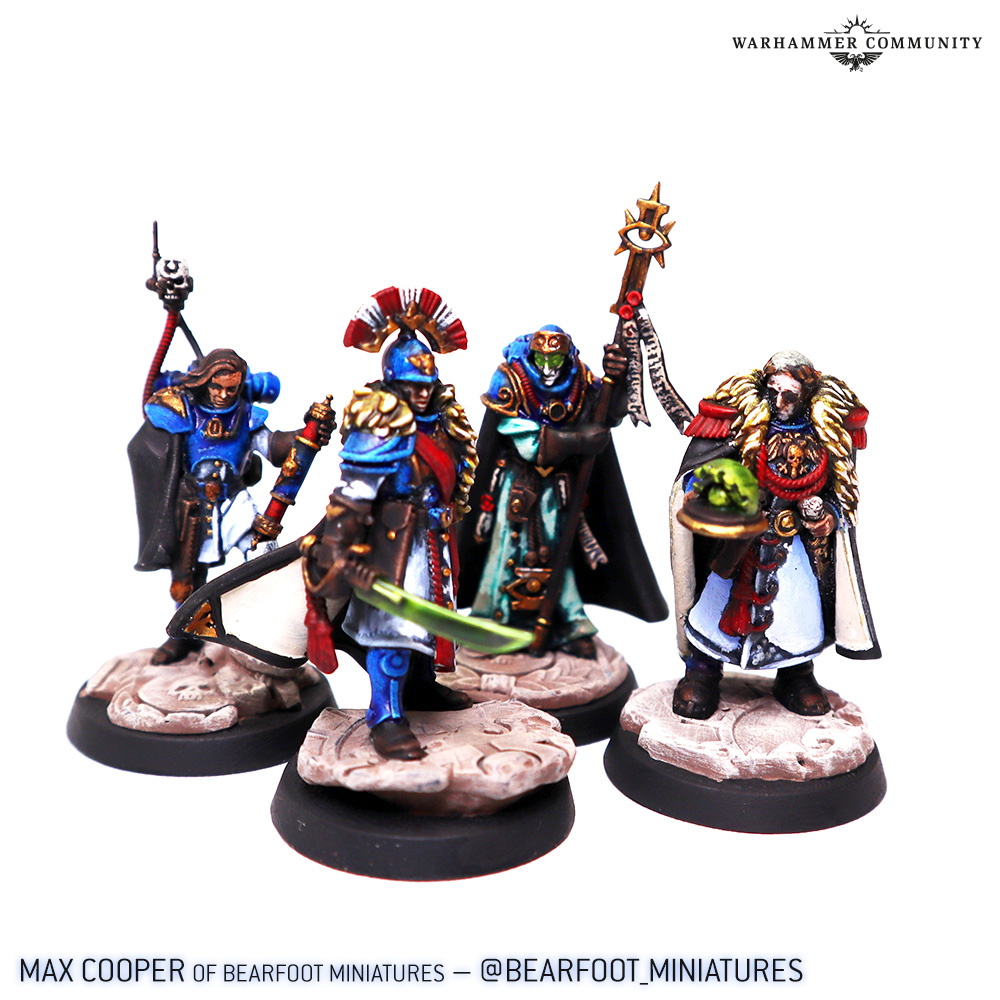 That provides us with a beautiful segue into the last showcase, which is a collection of humans from the Wardens of Ultramar. Sion Scannell and Quipster both tackled Astropath Dainal Kornelius and Legatus Aemelia Minervas, while Lukas Kuhn also painted the Astropath. Max Cooper of Bearfoot Miniatures painted the whole gang of humans, including Commodore Gaius Silva and Plenipotentiary Lucia Vestha.