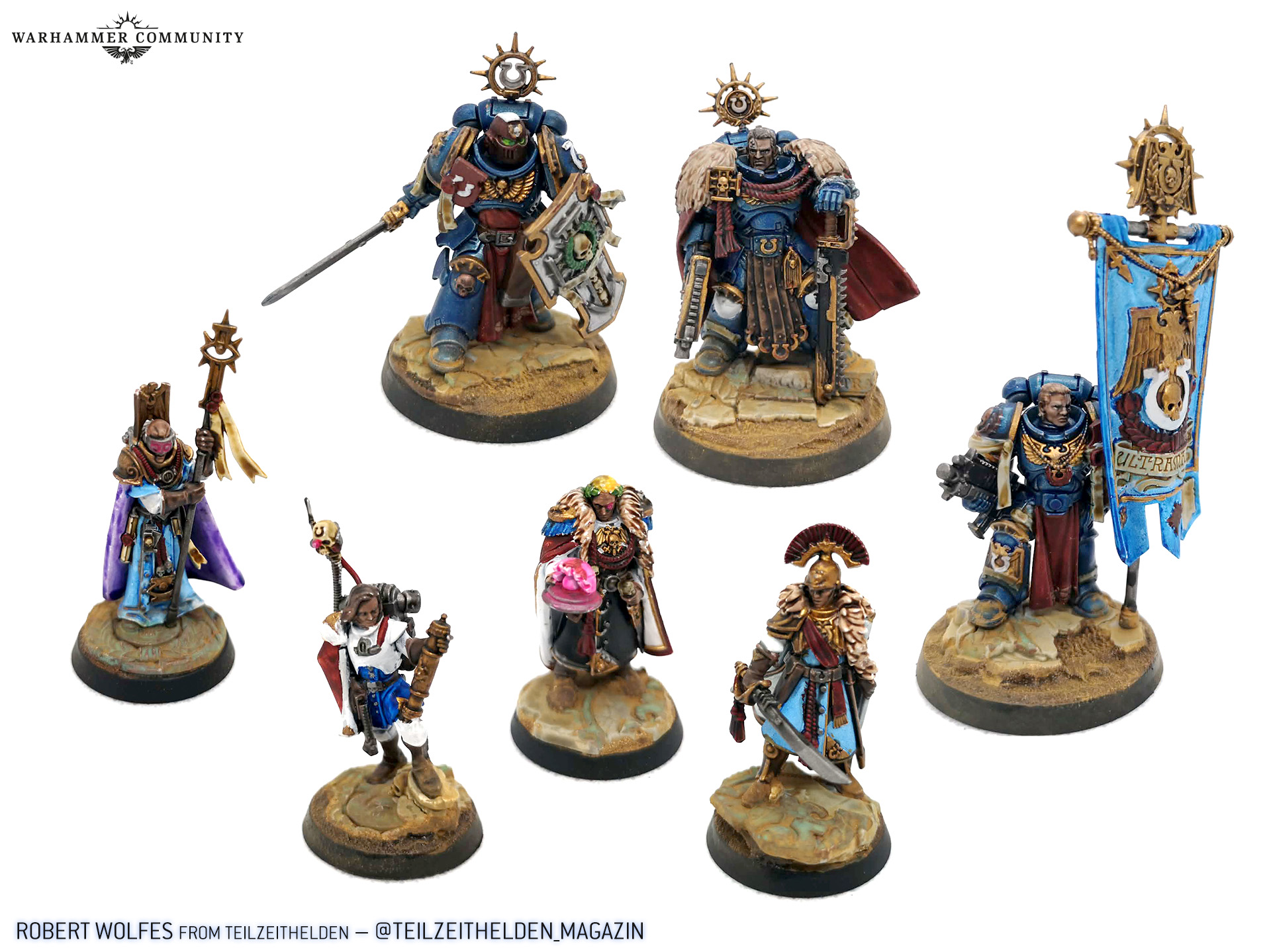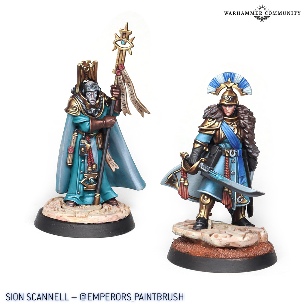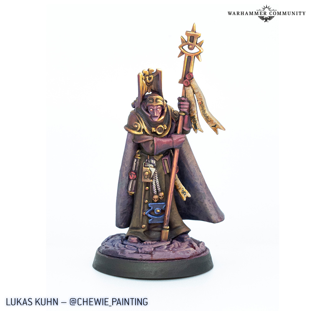 That provides us with a beautiful segue into the last showcase, which is a collection of humans from the Wardens of Ultramar. Sion Scannell and Quipster both tackled Astropath Dainal Kornelius and Legatus Aemelia Minervas, while Lukas Kuhn also painted the Astropath. Max Cooper of Bearfoot Miniatures painted the whole gang of humans, including Commodore Gaius Silva and Plenipotentiary Lucia Vestha.
