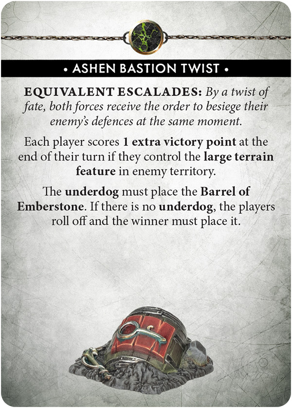 As experienced Spearhead commanders know, each army has a deck of battle tactics cards to draw from, each of which contains a goal to strive for and a command that can aid you. You can choose to score a battle tactic at the end of your turn for crucial victory points, or you can use the command for a one-off benefit – either way, the card is spent. Each side of the new gameboard in the City of Ash boxed set – the Shattered Crossroads or the Ashen Bastion – also has a twist deck associated with it. These add an additional rule for the battle round, which will usually be of most benefit to the player currently losing the game.