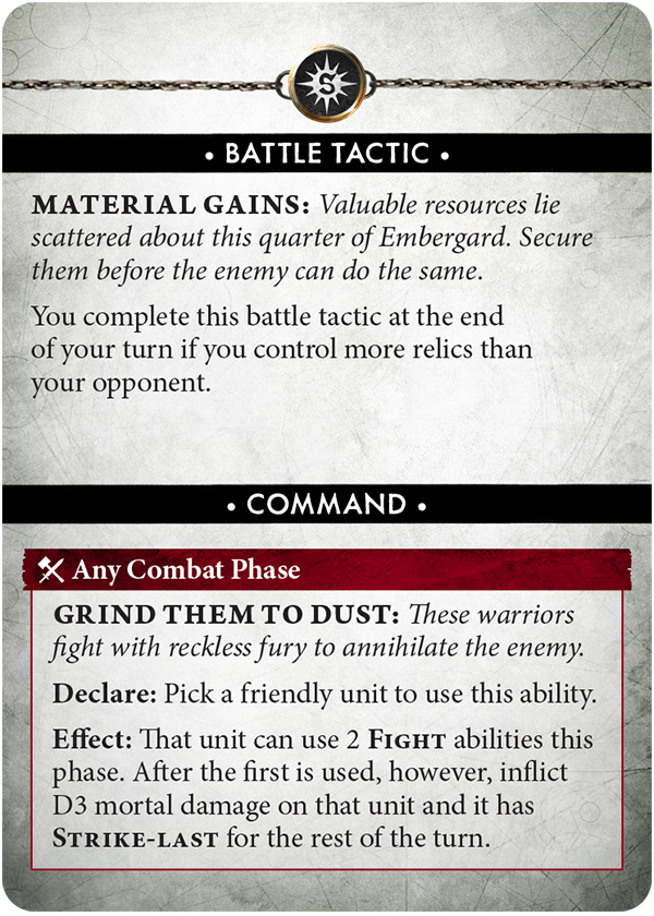 Certain battle tactics, such as Material Gains, make controlling relics even more important. Of course, if it looks like you might have lost out in the relic rush, you can always just unleash the Grind Them to Dust command, and attack twice with one of your units. This can be especially useful with the Gutter Runners and Night Runners, as they both have the Reinforcements keyword and so have less to fear from D3 mortal damage.