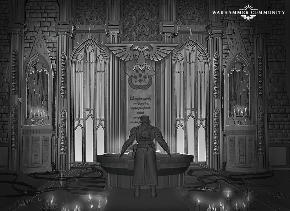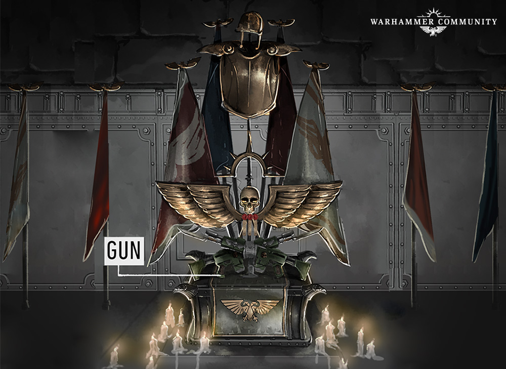 We only get an impression of the room he’s in, but we can already tell that it is certainly more opulent and comfortable than the conditions of his troops. In fact, it almost certainly wasn’t built as a comms hub.** What you might not have spotted is that he has a little regimental shrine against one wall. This reliquary includes the banners of the various regiments currently deployed to protect his city.