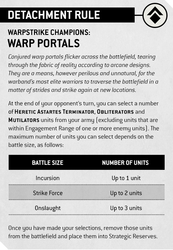 At the end of your opponent’s turn, you can select a number of HERETIC ASTARTES TERMINATOR, OBLITERATORS and MUTILATORS units from your army (excluding units that are within Engagement Range of one or more enemy units). The maximum number of units you can select depends on the battle size, as follows: