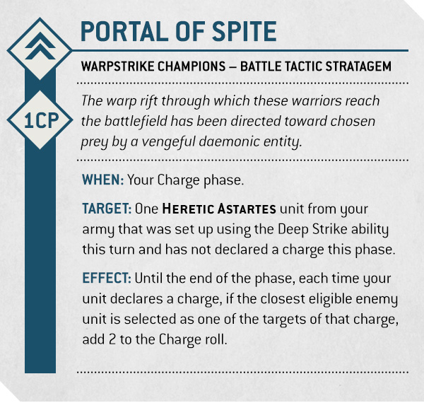 It will come as no surprise that this Detachment wants you to be Deep Striking all over the place, and with the ability to send two units back into the Warp every turn in a standard Strike Force-sized game, you’ll have plenty of chances to do it. Making successful charges right out of a Deep Strike is significantly easier when Portal of Spite adds an extra 2” to each chosen unit’s roll, while Warp-tainted objectives can be safely left behind knowing that they’ll stay under your control.