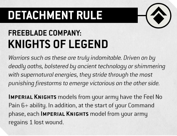 IMPERIAL KNIGHTS models from your army have the Feel No Pain 6+ ability. In addition, at the start of your Command phase, each IMPERIAL KNIGHTS model from your army regains 1 lost wound.