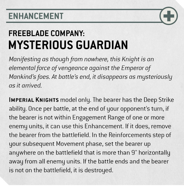IMPERIAL KNIGHTS model only. The bearer has the Deep Strike ability. Once per battle, at the end of your opponent’s turn, if the bearer is not within Engagement Range of one or more enemy units, it can use this Enhancement. If it does, remove the bearer from the battlefield. In the Reinforcements step of your subsequent Movement phase, set the bearer up anywhere on the battlefield that is more than 9" horizontally away from all enemy units. If the battle ends and the bearer is not on the battlefield, it is destroyed.