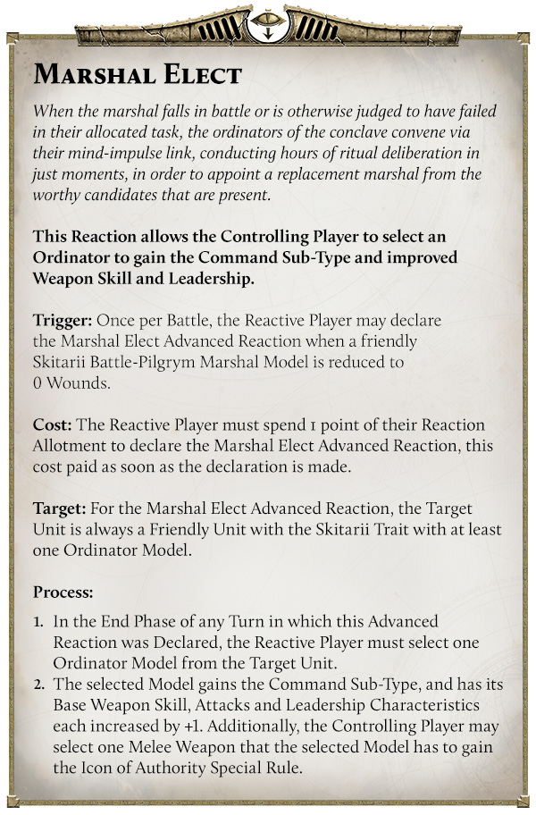 Trigger: Once per Battle, the Reactive Player may declare the Marshal Elect Advanced Reaction when a friendly Skitarii Battle-Pilgrym Marshal Model is reduced to 0 Wounds.