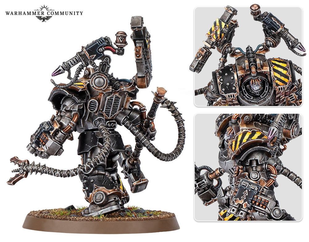 Long years of fighting in the deadliest frontal assaults imaginable has turned Kravek’s body into a siege weapon as powerful as any tank or daemon engine in his arsenal, built around an ancient suit of Cataphractii Terminator armour from the Horus Heresy that he calls his Iron Mantle. It bristles with weaponised mechatendrils and augmetics slaved to the armour’s mind impulse unit, though none are as deadly as Last Argument – his personally-crafted thunder hammer that crackles with infernal power.
