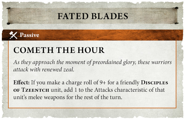 Effect: If you make a charge roll of 9+ for a friendly DISCIPLES OF TZEENTCH unit, add 1 to the Attacks characteristic of that unit’s melee weapons for the rest of the turn.