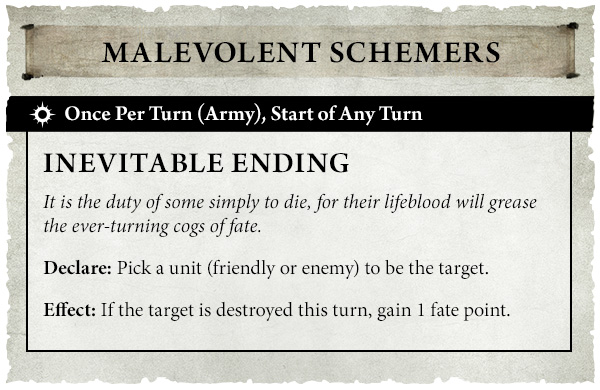 Perhaps you’re looking to guarantee you have more of these marvellous fate points at your disposal? Look no further than either Malevolent Schemers or Denizens of the Silver Towers, the former allowing you to mark a unit (friendly or enemy) for death each turn, and if your prediction comes true, you gain a fate point. The latter gives you a 50% chance to receive a fate point back after spending any.