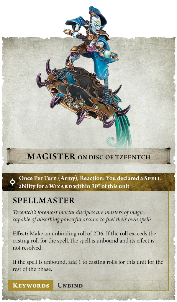 The Magister and Magister on Disc of Tzeentch both interact with the Kairic Tome in an interesting way. Their Spellmaster ability allows these units to attempt to unbind your own spells, not only guaranteeing you a chance at receiving a fate point, but giving the Magister +1 to cast in return. This can give your Wizards something useful to do, even if your opponent has managed to remain too far away for most of your spells.