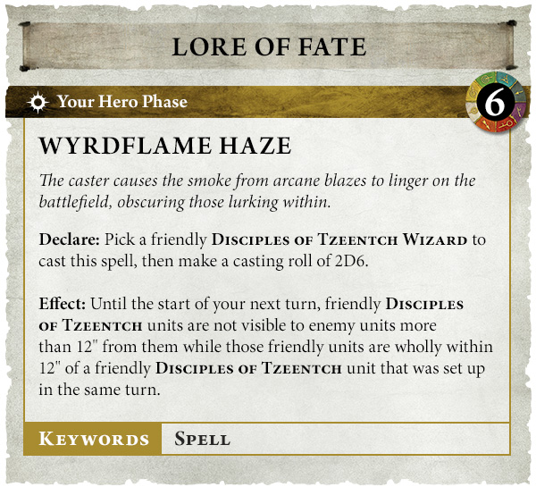 While the Lore of Fate’s unlimited spell Infernal Gateway has the potential to do massive amounts of mortal damage spread out amongst a number of casters and targets, my favourite spell of that lore is Wyrdflame Haze, which creates an obscuring bubble around any Disciples of Tzeentch unit that was set up in the same turn.