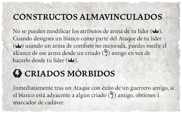 Inmediatamente tras un Ataque con éxito de un guerrero amigo, si el blanco está adyacente a algún criado amigo, obtienes 1 marcador de cadáver.