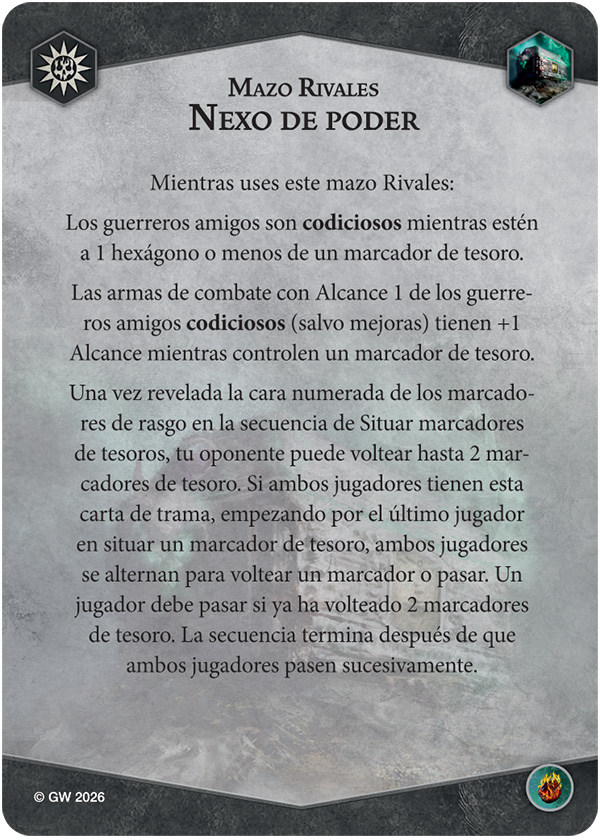 Las armas de combate con Alcance 1 de los guerreros amigos codiciosos (salvo mejoras) tienen +1 Alcance mientras controlen un marcador de tesoro.