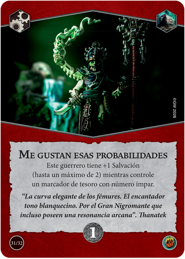 Úsala en tu paso de poder. Retira alguno de tus marcadores de cadáver. Designa un Cosechador Mortis amigo muerto, y después tira un dado de ataque por cada marcador de cadáver retirado. Si el resultado incluye algún o , Levanta a ese guerrero y sitúalo en un hexágono inicial de territorio amigo. Solo puedes usar esta habilidad una vez por ronda de batalla.