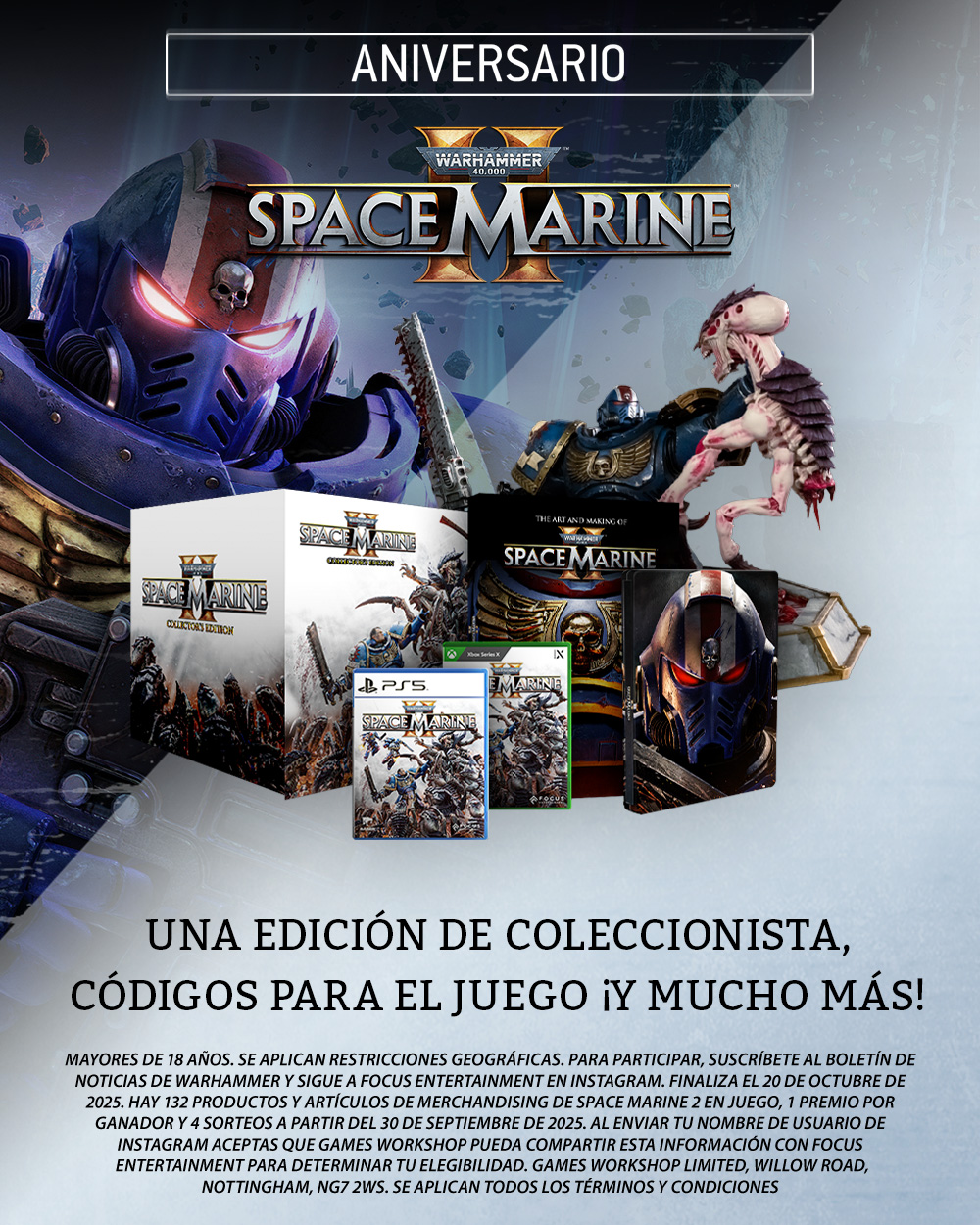 * Mayores de 18 años. Se aplican restricciones geográficas. Para participar, suscríbete al boletín de noticias de Warhammer y sigue a Focus Entertainment en Instagram. Finaliza el 20 de octubre de 2025. Hay 132 productos y artículos de merchandising de Space Marine 2 en juego, 1 premio por ganador y 4 sorteos a partir del 30 de septiembre de 2025. Games Workshop Limited, Willow Road, Nottingham, NG7 2WS. Se aplican todos los términos y condiciones.