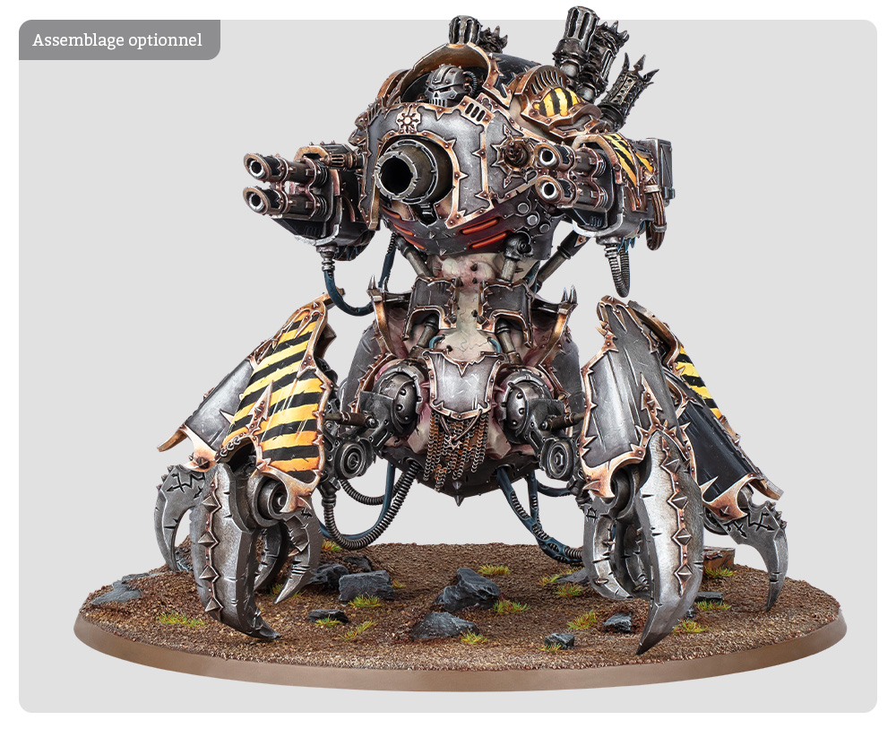 Le Profanateur dispose d’assez d’options d’assemblage pour impressionner les Techmanciens les plus blasés. Il propose deux options de position de torse, trois options de carapace, deux plaques pectorales interchangeables, quatre têtes de Space Marines du Chaos classiques, ainsi qu’une tête pour chacune des légions que sont les Iron Warriors, les Word Bearers, les World Eaters, les Thousand Sons, les Emperor’s Children et la Death Guard, et deux options pour chacune des épaules. Cela signifie que tous vos redoutables marcheurs seront uniques.