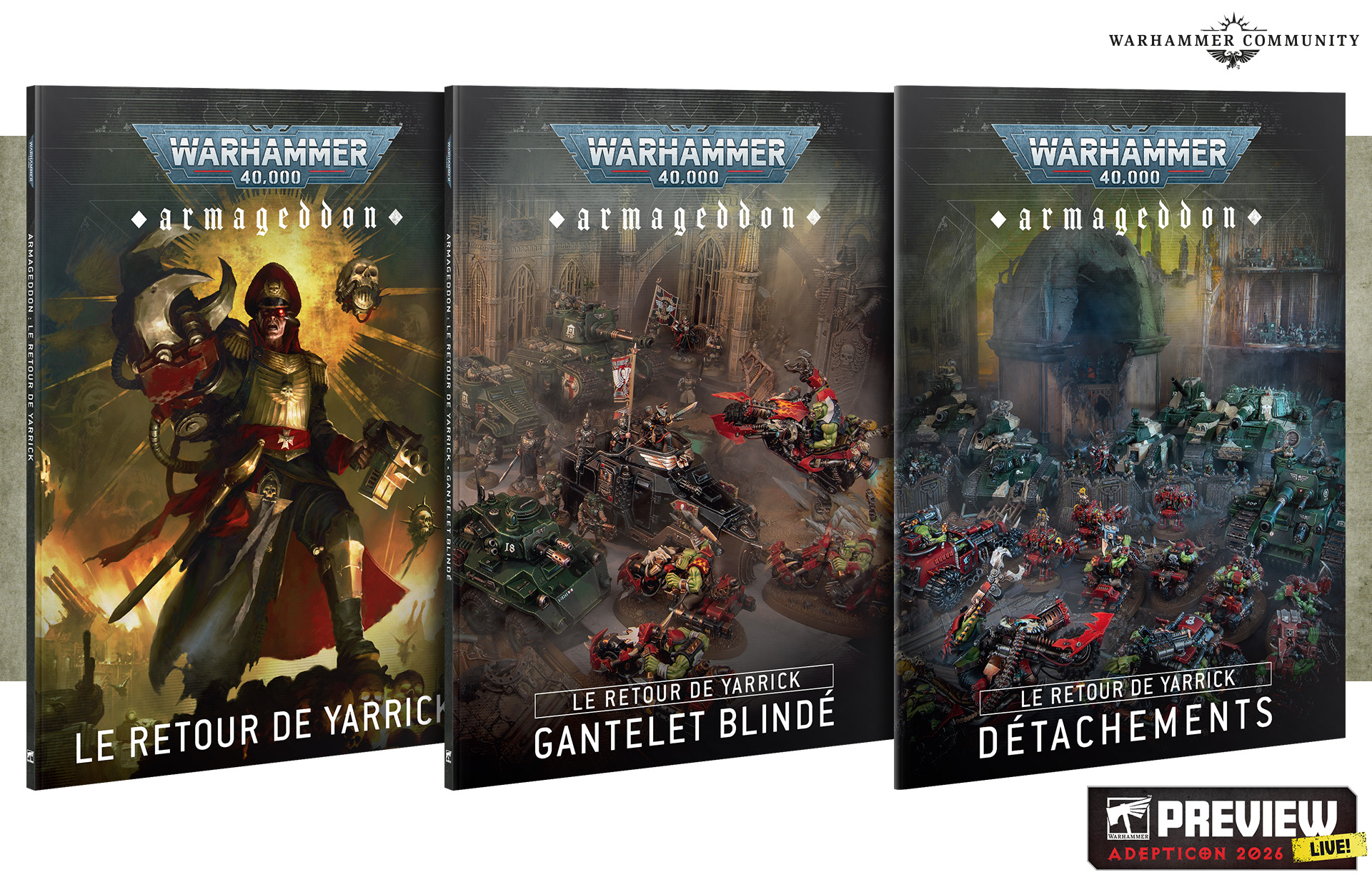 Le récit du retour de Yarrick sur Armageddon et des combats désespérés contre la Turbowaaagh! de Wazdakka Gutsmek est raconté dans Armageddon: Le Retour de Yarrick, la prochaine extension majeure pour Warhammer 40,000. Armageddon est divisé en trois livres rassemblés dans un étui décoratif, proposant des trésors de règles inédites et d’historique en un set pratique.
