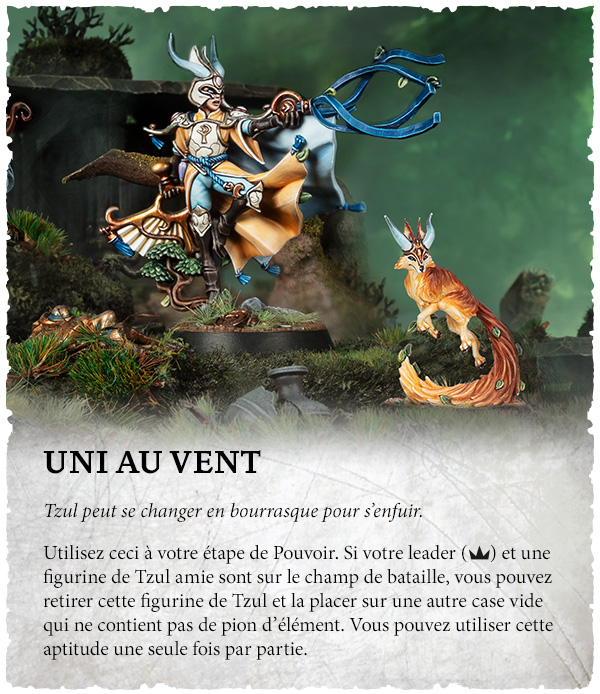 Cette nouvelle bande se compose de maîtres de l’anémologie* des temples hurakains, venus s’encanailler dans les profondeurs de Gardebraise. Les Zéphyrites de Thyrielle sont une bande de style Maîtrise constituée de quatre Suzerains Lumineths et de Tzul, l’esprit vulpin qui leur sert de compagnon. Le truc, c’est que Tzul n’est pas un combattant, mais un pion, dont le placement sur le plateau de jeu déterminera la portée des aptitudes de la bande.