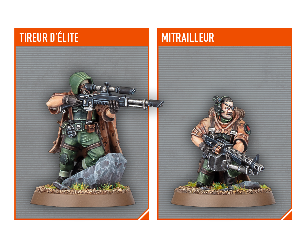 Les membres de l’Escouade Spectre sont dotés d’armures légères et de capes de camouflage leur permettant de se mouvoir sans être détectés sur les terrains accidentés, et ils emploient des tactiques d’embuscade pour éliminer les cibles les plus coriaces. Là où un Garde Impérial standard pourrait par exemple penser que les fusées Starshell ne sont bonnes qu’à illuminer les champs de bataille, les “Spectres” savent que leur éclat aveuglant est aussi parfait pour étourdir une salle remplie d’ennemis.