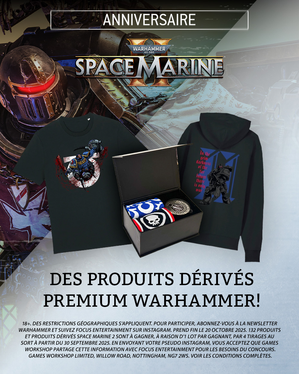 * 18+. Des restrictions géographiques s’appliquent. Pour participer, abonnez-vous à la Newsletter Warhammer et suivez Focus Entertainment sur Instagram. Prend fin le 20 octobre 2025. 132 produits et produits dérivés Space Marine 2 sont à gagner, à raison d’1 lot par gagnant, par 4 tirages au sort à partir du 30 septembre 2025. Games Workshop Limited, Willow Road, Nottingham, NG7 2WS. Voir les conditions complètes.