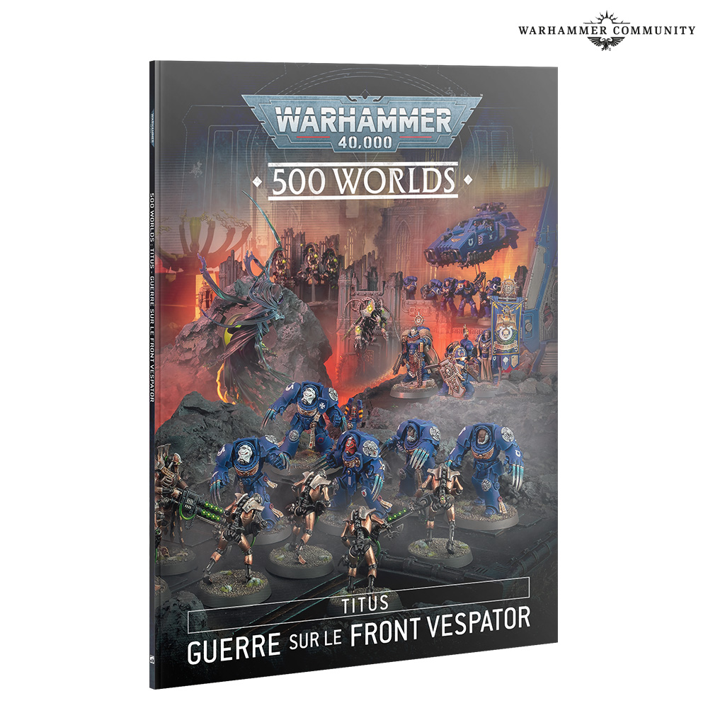 500 Worlds: Titus – Guerre sur le Front Vespator est un livre de 56 pages contenant les règles permettant de mener une campagne avec carte pour deux joueurs ou plus, basée sur le Front Vespator. Elles vous fournissent le cadre pour livrer cette campagne en détaillant les différents théâtres de guerre et six nouvelles missions agrémentées de règles thématiques qui évoquent ce conflit. Sont également incluses une carte de campagne dépliante séparée et une planche proposant 252 autocollants.