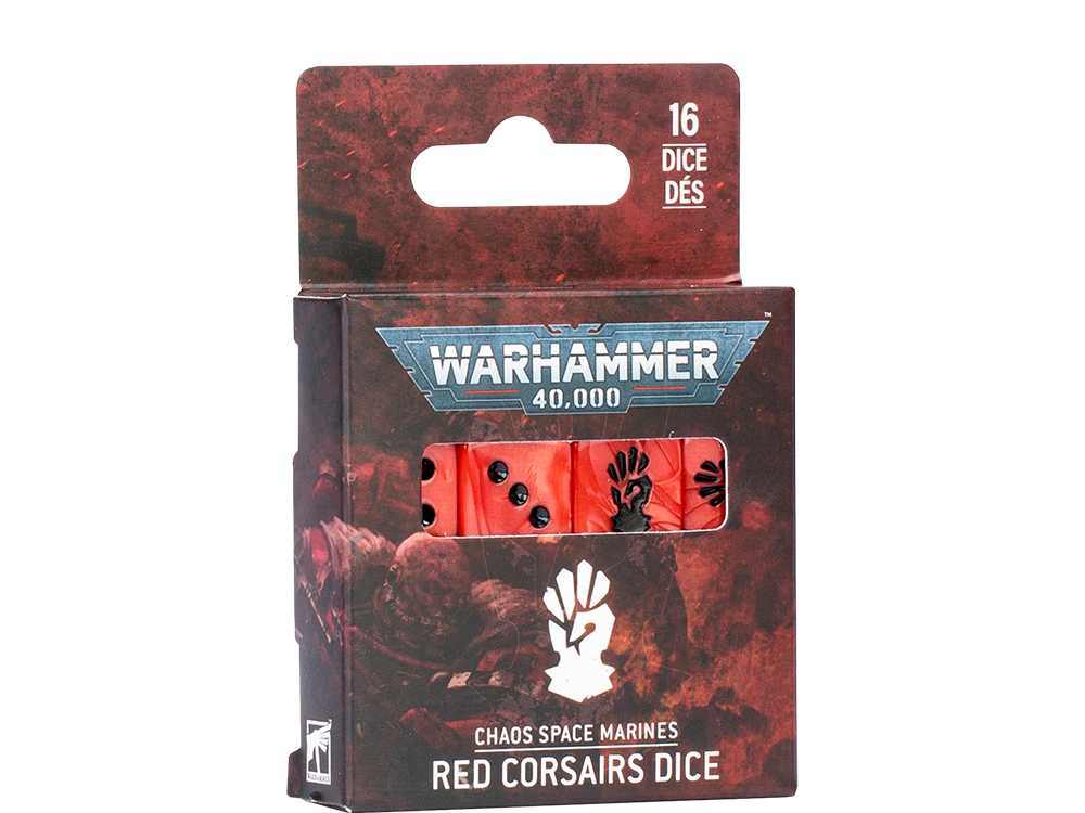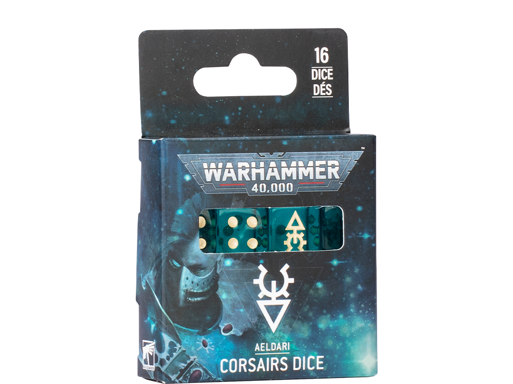 Un bon pirate a besoin de talent, de style et d’un petit soupçon de chance. Le talent dépend de vous, mais le style et la chance sont à votre portée avec les dés thématiques des Corsaires Aeldari et des Red Corsairs. Chaque boîte contient 16 dés moulés en plastique nacré, respectivement bleus et rouges, et qui arborent leur icône de faction à la place du six, parce que c’est le chiffre que vous verrez le plus souvent. On croit en vous.