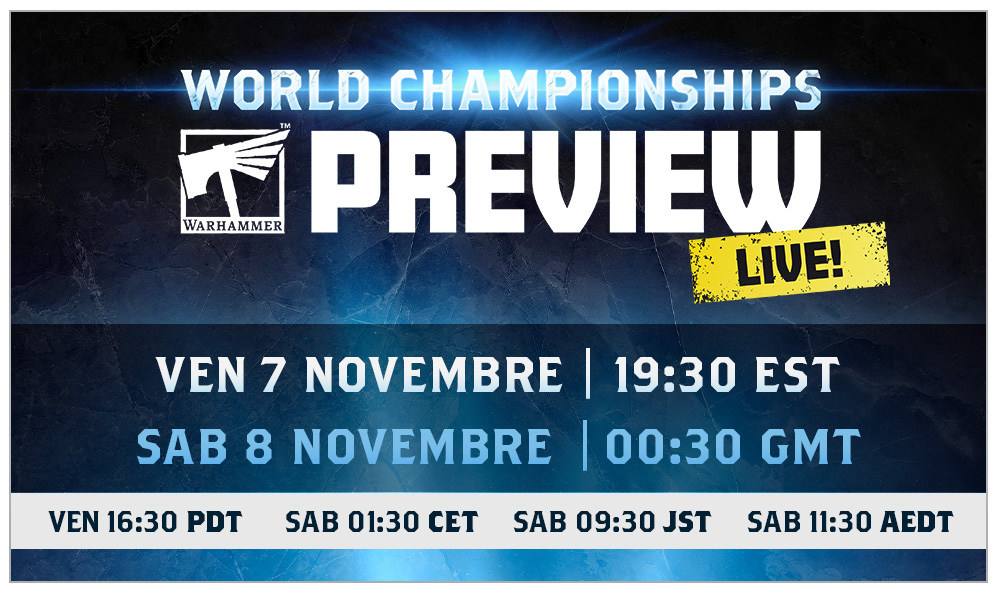 Chi si unirà a noi ad Atlanta potrà assistere di persona alla World Championships of Warhammer Preview, mentre chi ci segue da casa potrà guardarla in diretta. Collegati il 7 novembre alle 19:30 EST; per chi vive nel Regno Unito e in Europa, lo spettacolo inizierà in seconda serata alle 00:30 GMT dell’8 novembre.