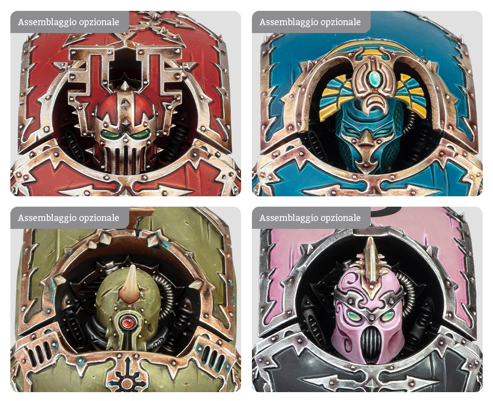 Il Profanatore ha così tante opzioni di assemblaggio da stupire perfino l’Artefice del Warp più imperturbabile. Dispone infatti di tre pose per il torso, tre opzioni per il carapace, due pettorali intercambiabili, quattro teste per gli Space Marines del Caos, una testa rispettivamente per Iron Warriors, Word Bearers, World Eaters, Thousand Sons, Emperor’s Children e Death Guard, nonché due opzioni per la spalla destra e due per la sinistra. In questo modo non avrai mai due camminatori uguali.
