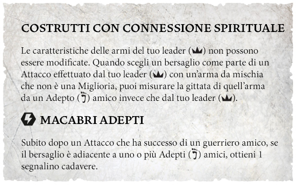 Subito dopo un Attacco che ha successo di un guerriero amico, se il bersaglio è adiacente a uno o più Adepti amici, ottieni 1 segnalino cadavere.