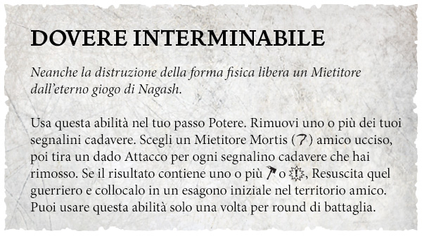 Usa questa abilità nel tuo passo Potere. Rimuovi uno o più dei tuoi segnalini cadavere. Scegli un Mietitore Mortis amico ucciso, poi tira un dado Attacco per ogni segnalino cadavere che hai rimosso. Se il risultato contiene uno o più o , Resuscita quel guerriero e collocalo in un esagono iniziale nel territorio amico. Puoi usare questa abilità solo una volta per round di battaglia.