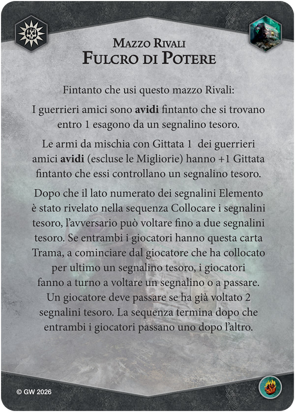 La Decima di Thanatek è accompagnata dal mazzo Rivali Fulcro di Potere. Si tratta di un mazzo in stile Flex che si abbina benissimo ai nuovi Ossiarchi Mietitori o a un’altra banda da guerra in stile Flex,** come gli Akkalappiabeztie di Borgit. Il set introduce la regola avido, che interagisce con entrambi i termini dell’equazione Flex, ovvero rivendicare i segnalini Tesoro e uccidere i combattenti nemici.