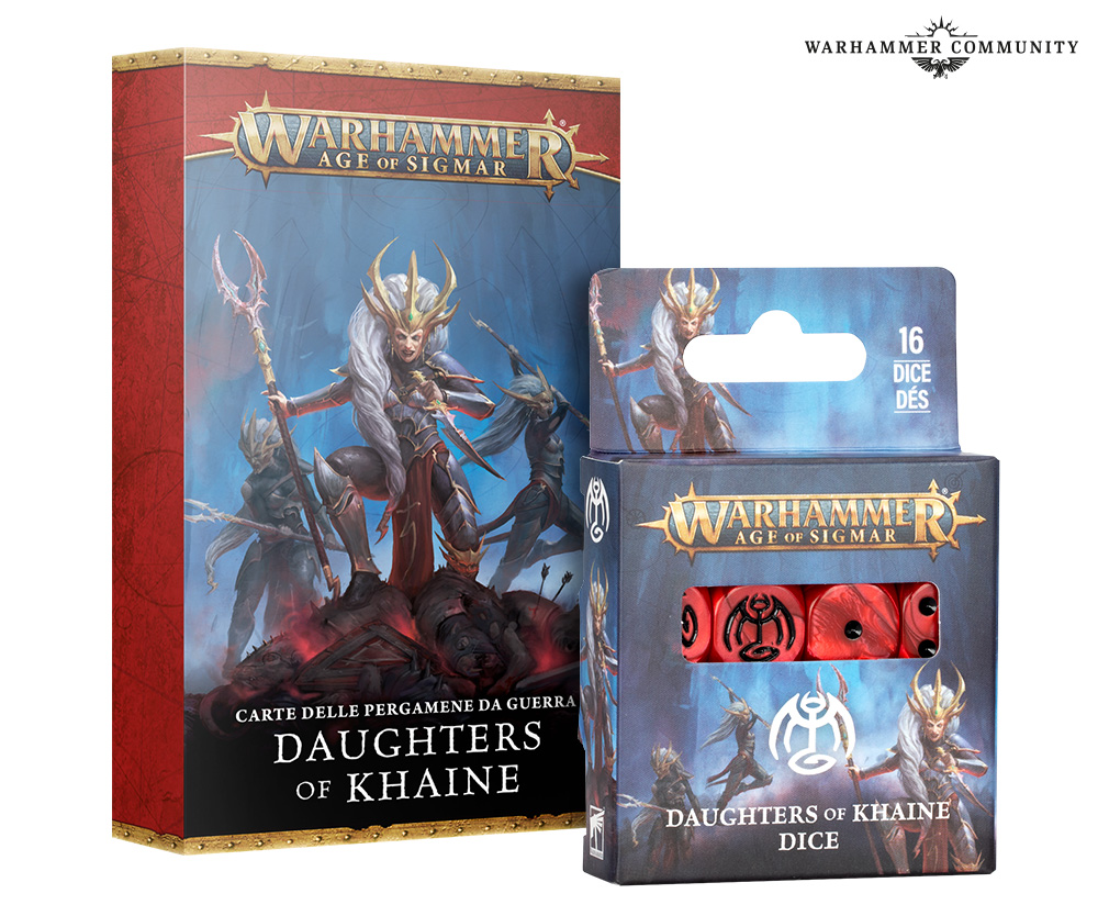Carte delle pergamene da guerra e dadi delle Figlie di Khaine