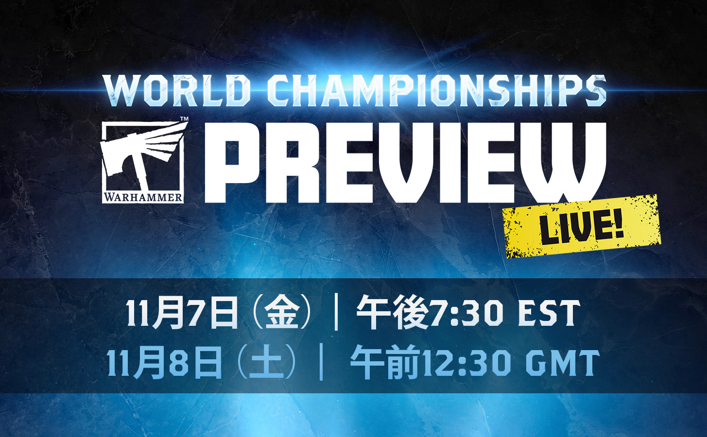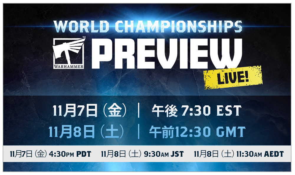 アトランタのイベントに参加するみんなは、世界大会ウォーハンマープレビューを実際に見られることだろう。一方で自宅にいる予定の皆は、ライブ中継で画面越しに観ることができる。アメリカ東部標準時(EST)では11月7日午後7:30から、イギリスとヨーロッパでは11月8日午前12:30から観ることができる。日本時間(JST)では11月8日午前9:30から中継が開始されるので、お見逃しなく。