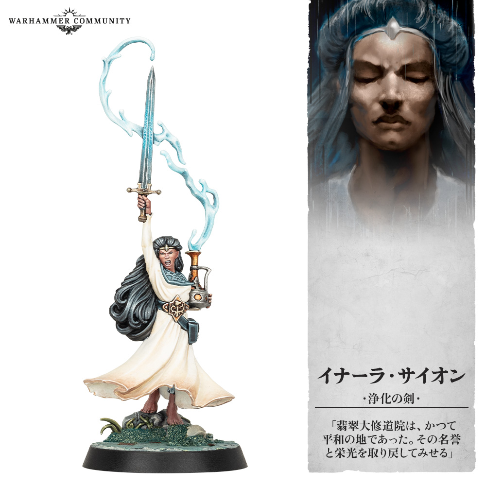 サイオンは比類なき水魔導師であり、シグマー信仰を奉じつつもアラリエールに従っており、穢れに対する戦いにおいて両神の力を呼び起こす。彼女は遥か昔に“常春の泉”から汲んだ清浄なる液体を詰めた壺を所持しているが、この品には驚くべき神秘の力が宿っている。また、佩用する剣は金属から鍛造されたものではない。生ける液体によって形作られたものであり、遠距離から敵を目掛けてしなり、打ち付ける武器なのだ。