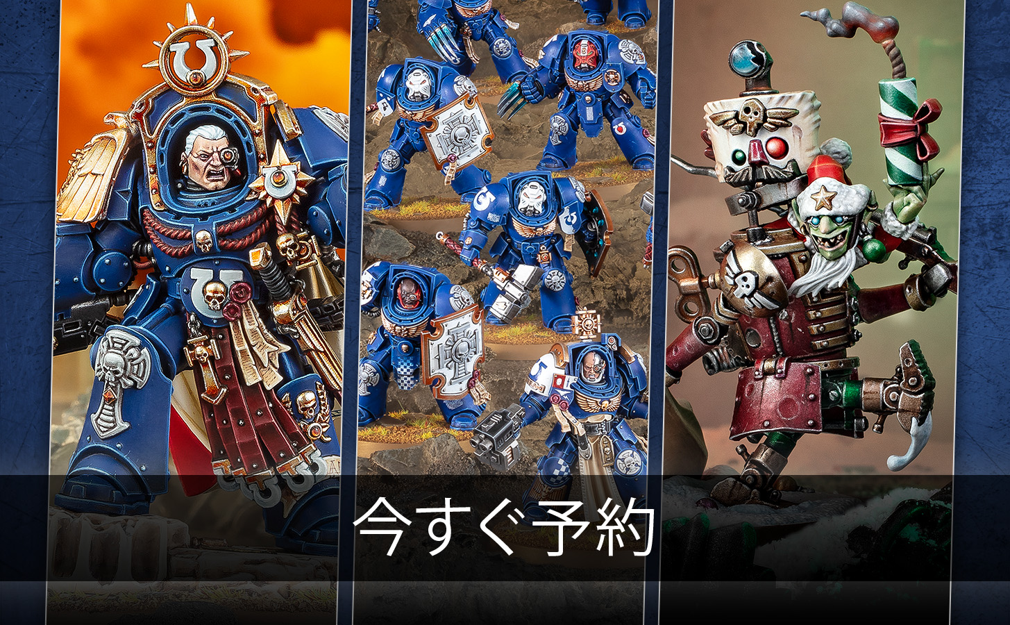 ウルトラマリーンの最も名高き英雄の2人が新たなミニチュアとなって戦闘へと赴き、彼らは旗を掲げた。この英雄たちに加えて発売となるのは、新コンバットパトロールとターミネイターが詰まったバトルフォース、新たなヴィクトリクス・オナーガードだ。バトルフォースには、このボックスで初めて手に入れられる新しいアサルト・ターミネイターも同梱されているぞ。さらに、新しくカンヅメのようなものに入ったレッド・ゴッボが、多数のBlack Libraryの書籍とともにガチャガチャと音を立てながら登場した。なんて太っ腹なやつだ! 彼自身について描かれた書籍も何冊かあるぞ!