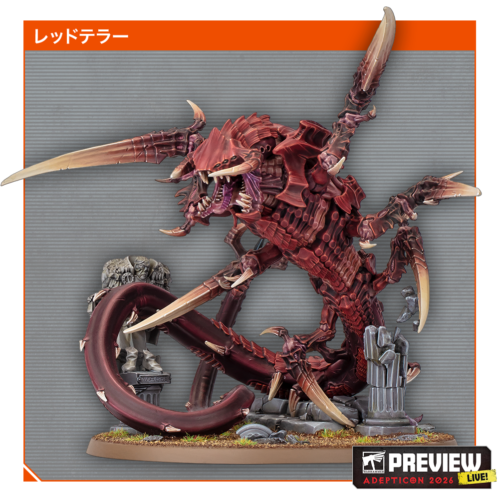 ティラニッドのベテランプレイヤーなら、ウォーハンマー40,000の過去のコデックスでレッドテラーの名を見たことがあるかもしれない。そのミニチュアが今回、銀河を再び恐怖に陥れようと、プラスチック製の単体キットとなって戻ってくる! この巨大な蛇のような怪物は、生体資源を呑み込むとダメージを再生できるというユニークなアビリティを持っているのが特徴だ。さらに、キルゾーンの地下に潜り込み、敵の特務兵を丸呑みできる機会が来るまで身を潜めることもできる。